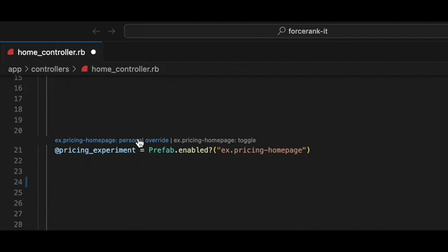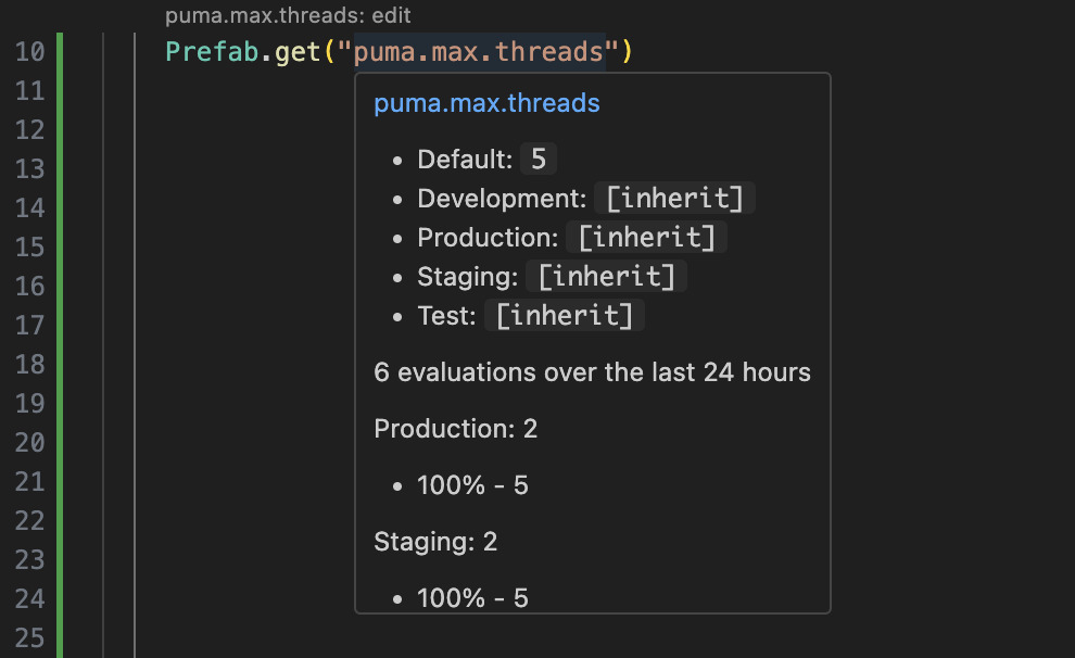 Just hover over the variable in your editor and see the value in all environments, along with the latest evaluation data.